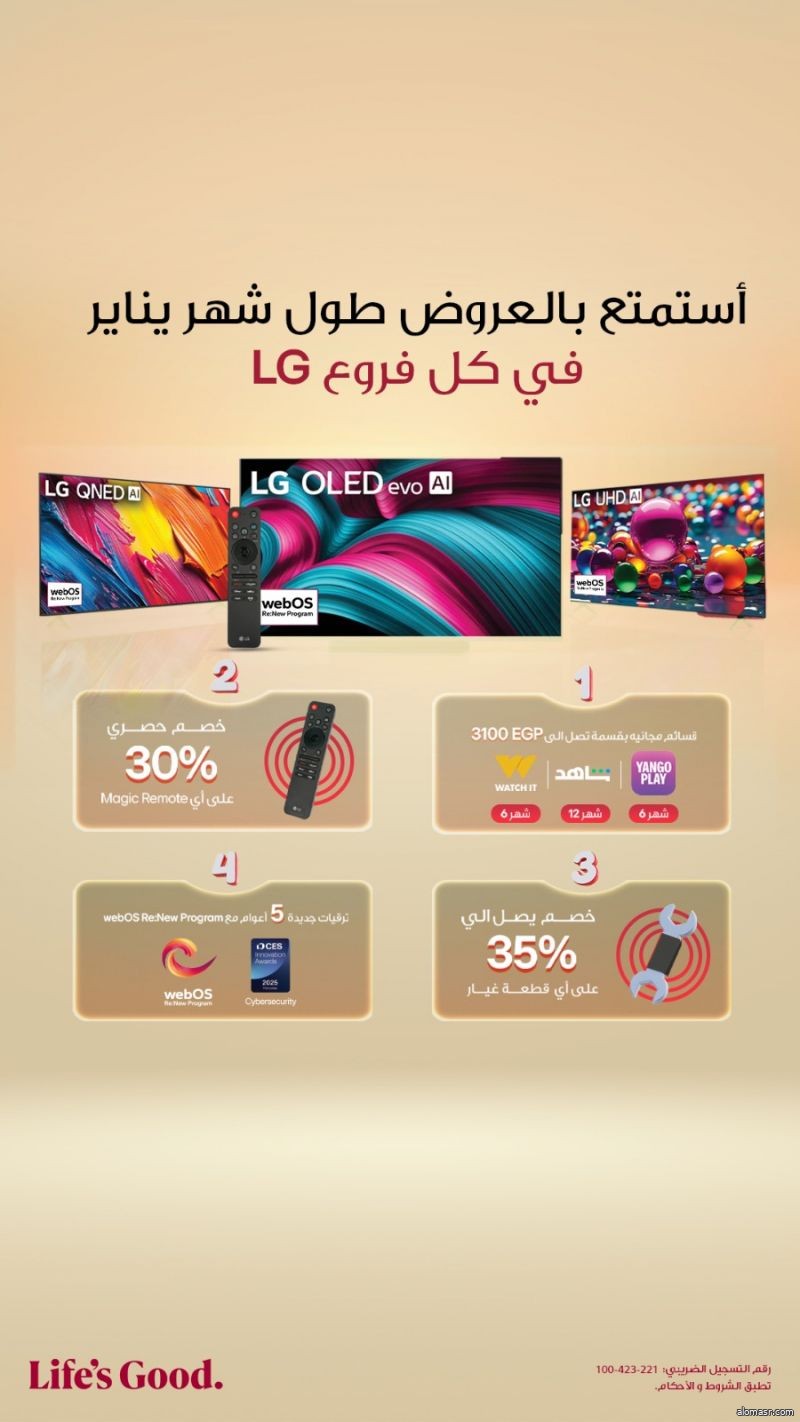 وتستمر العروض خلال شهر يناير، وتشمل مجموعة من أجهزة التلفزيون والأجهزة المنزلية، والتي تتوافر في معارض "إل جي" الرسمية وكذلك محلات ومعارض بيع الأجهزة المزلية.
